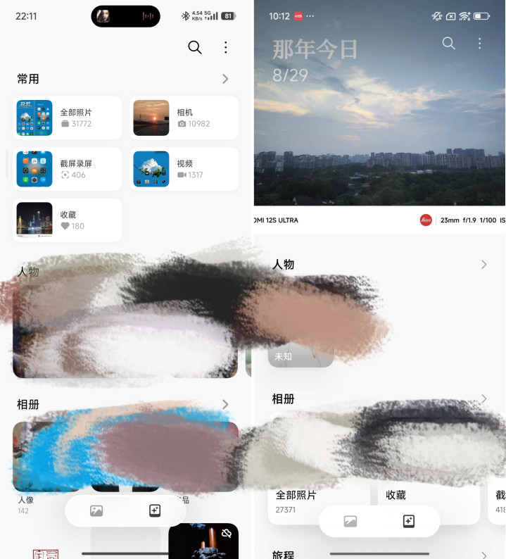 要说澎湃OS 2上让小雷最不满意的一个更新就是相册布局,布局变得混乱不说,操作逻辑也不怎么自然,虽然小米给了许多自定义设置板块,但还是没有老相册好用。好在澎湃OS 3对相册也来了一波改动,如今常用的相机、视频、截屏等全部直接放置最上面,而人物、相册分类、创作等次要选项被放在下方,这才符合自然操作逻辑。